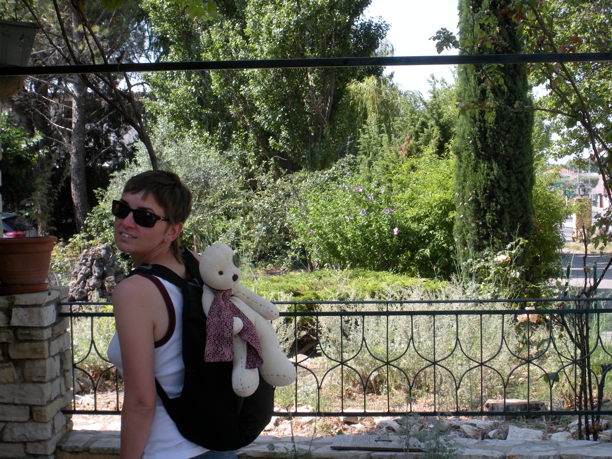 He doesn’t complain much… He weighs next to nuthin’ and he is rather friendly. When we last visited England & France, Harold saw London, Paris & Provence backwards… I imagine that this is a little frustrating… But like I said, Harold doesn’t complain much. This time around, I have a slightly different contraption for the backpack here. It’s a clip that’ll make grabbing Harold for a photo-taking opportunity much easier. Still, he will get to see Western France from the same point of view… Backwards.