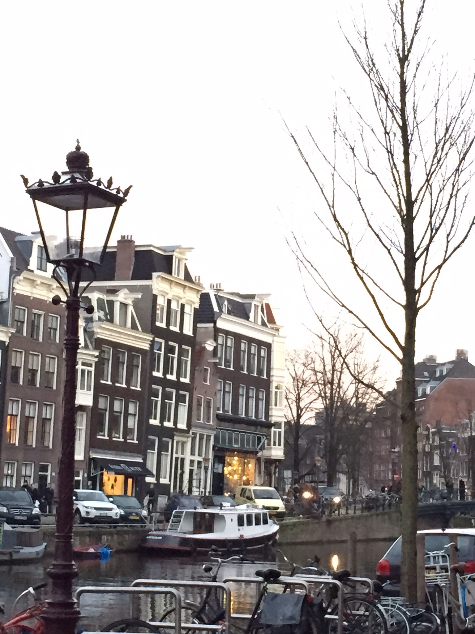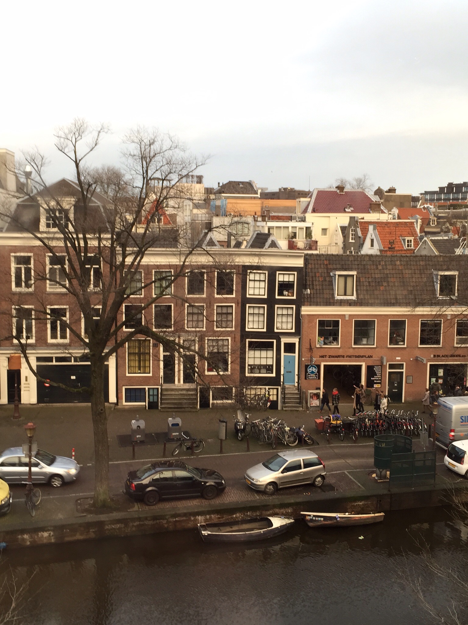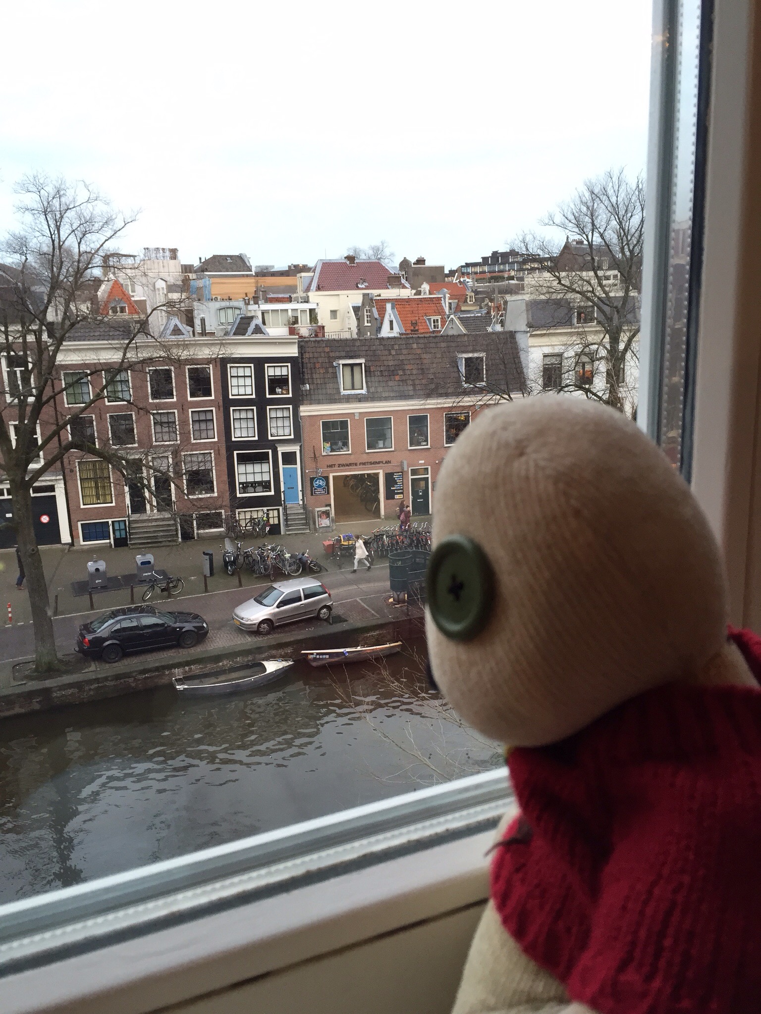 Amsterdam seems to like fireworks… Starting at 12 pm noon, the Ka-booms have been ongoing … Startling pigeons & tourists & setting off alarms. It gets dark early and stays dark until 9am ish. So right now it feels much later than seven pm. We have walked all around Amsterdam today… Up to Dam Square and the Nine Streets… Ducking into shops & charming boutiques. We fell into a kaas shop (cheese) & came out with a local goat kaas, salami and a baguette… Dinner! Mmmmm. Now we are waiting around for a jazz club to entertain us tonight. Jazz is popular here… And it seems that they like American disco & oldies & Johnny Cash … Vinyl record shops are all over!
