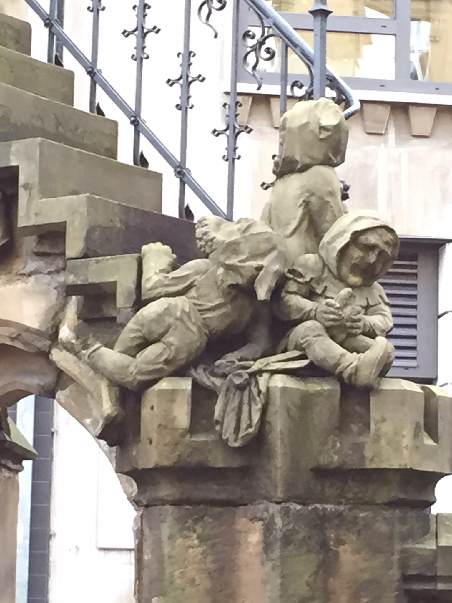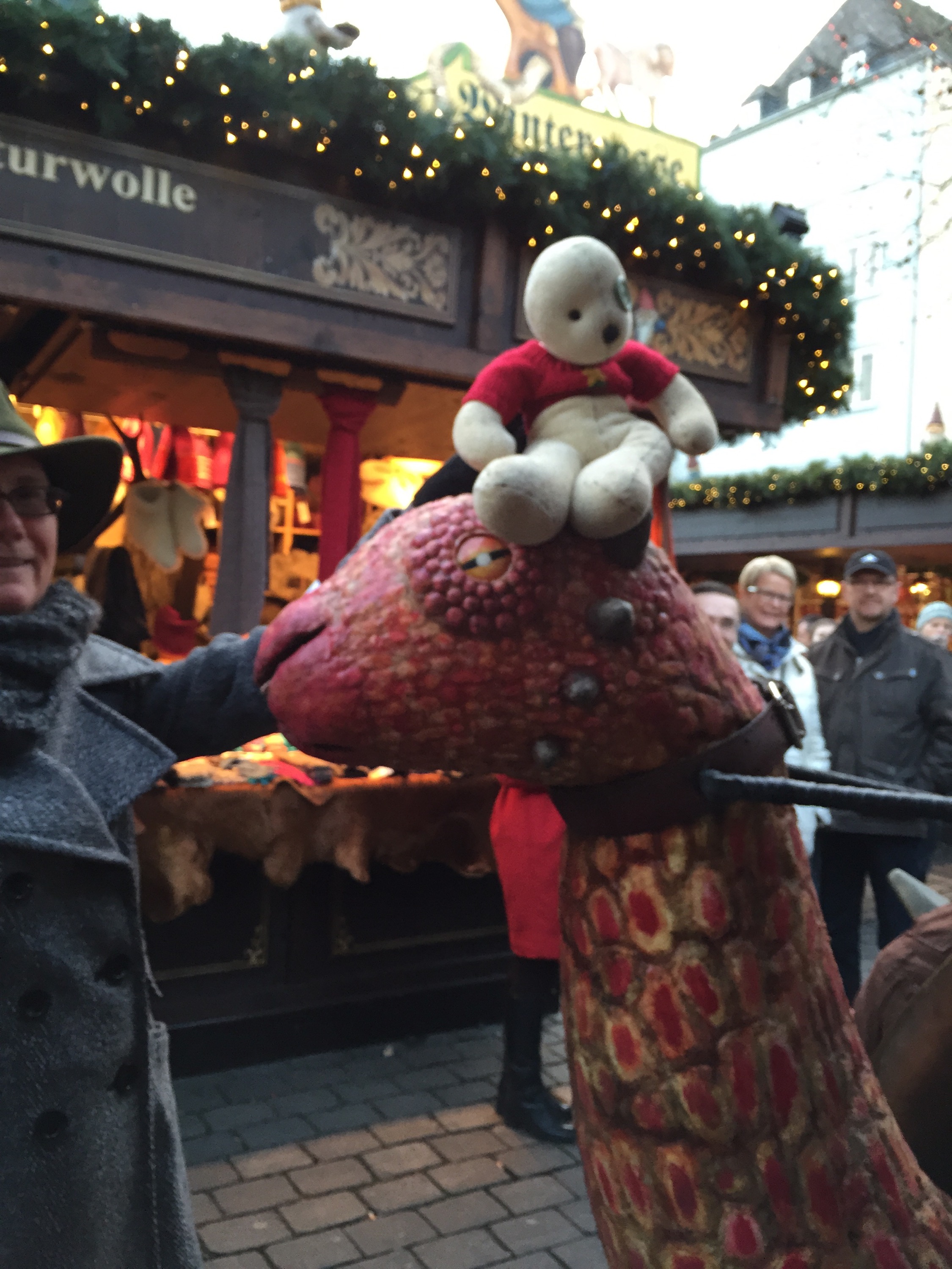 Today, Sunday, we woke up late and spent an hour or so doing laundry, then went for a long walk around the city. The canals of Le Petite France, church of St. Paul’s reflected in the River ill, the lovely public sculptures and outstanding architecture of this city showed us why it has been declared a UNESCO World Heritage site for its unique beauty and history. We had to keep stopping to refuel…hot chestnuts, coffee, and other tasty snacks held us until we returned to Les Armes du Strasbourg for dinner. We have now soaked in a hot tub and are jello-y and ready for bed. Goodnight! (wave good-night, Harold…nope, he’s asleep).