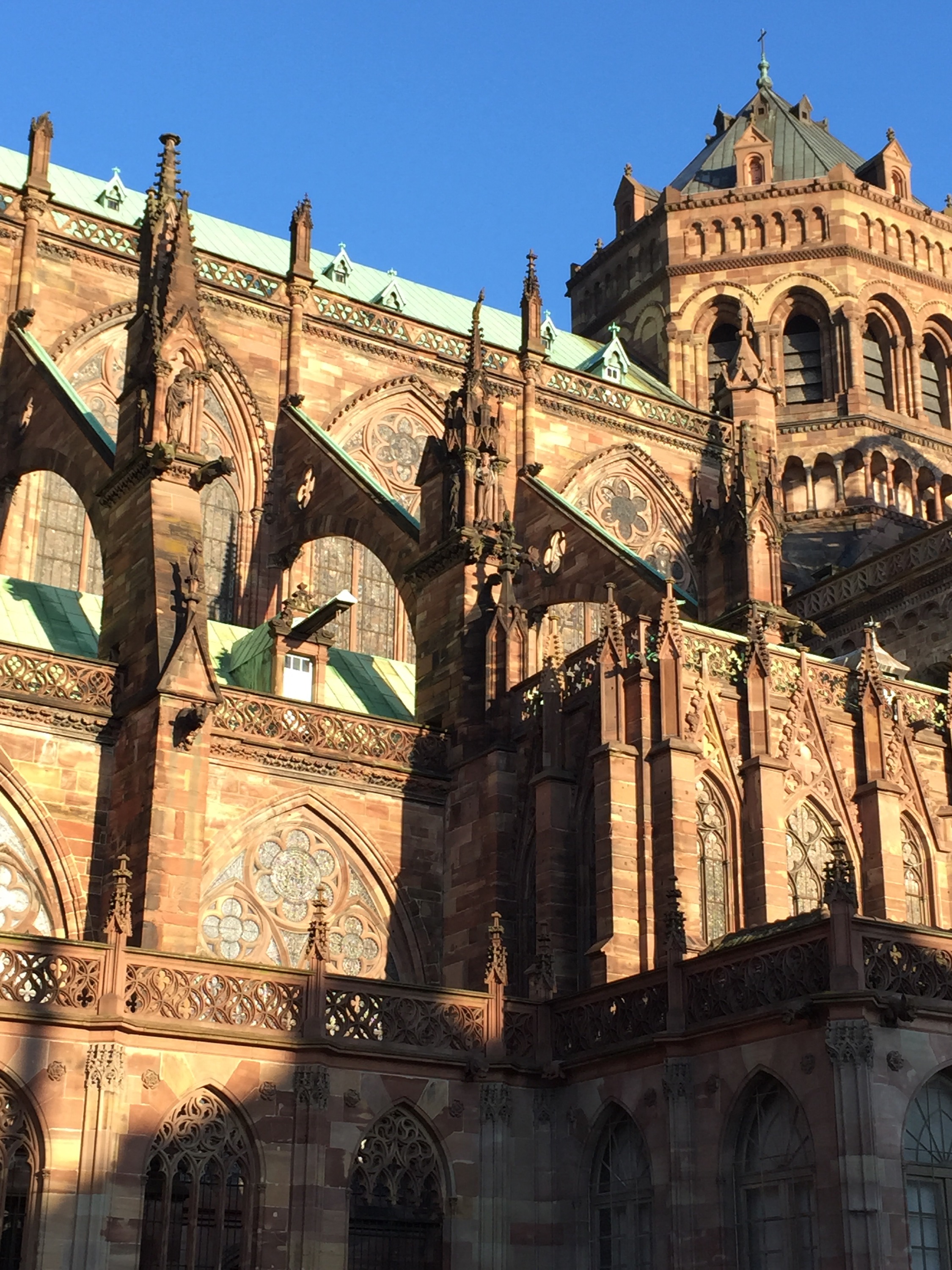 After re-fueling at Le Stub (The Stork) we visited The Strasbourg Cathedral. Smaller than Cologne ( because everything is) and simpler than St. Bavo’s in Ghent, this cathedral is RIGHT in the middle of town. You turn a corner and it just loooooms above you. And when the bells begin to peal, hold onto something. it’s like listening to a church roll downhill.. bongbongbongadabong!!!!!!